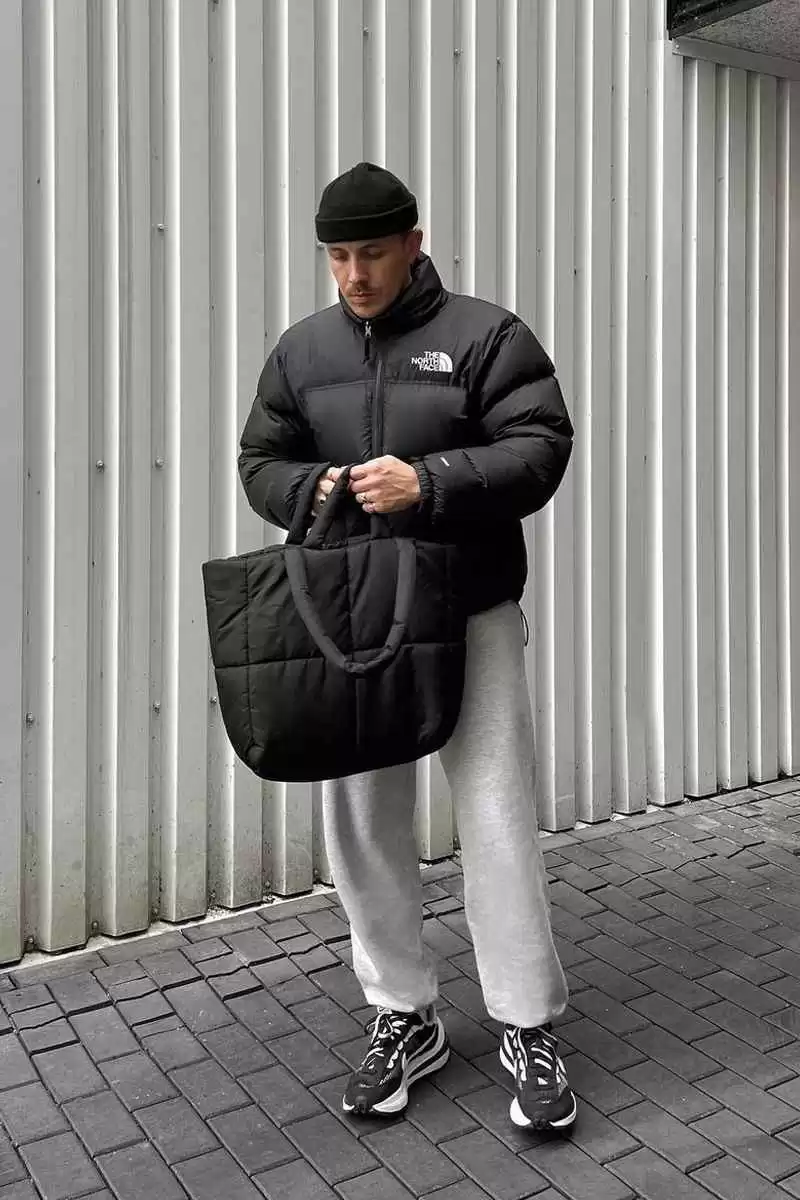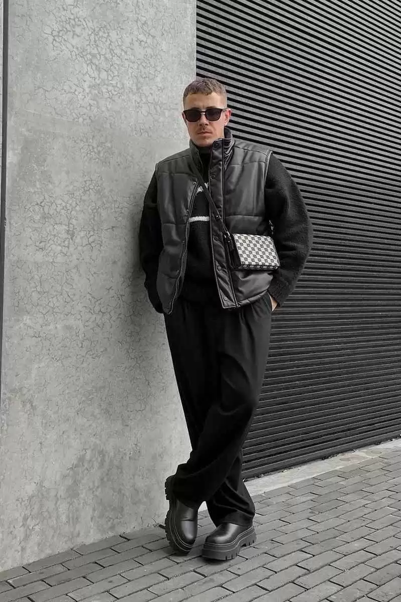 1米55男生秋冬穿黑灰色马甲,上衣短款,下装卫裤不显矮。卫衣减龄有活力,整体简洁为主。
