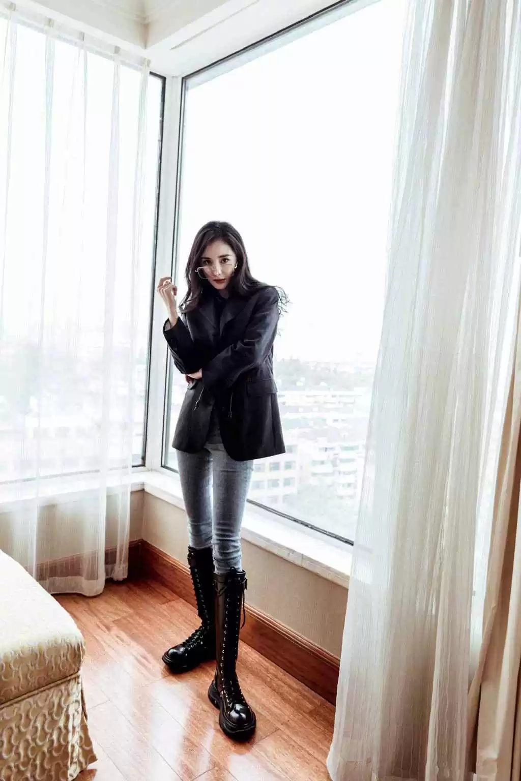 喜欢裤装的姐妹也别急,长靴配裤子时,我更推荐把裤腿塞进靴子里,这样看起来利落又霸气。可以参考杨幂的穿法,选一双靴型挺括的骑士靴,帅气十足。