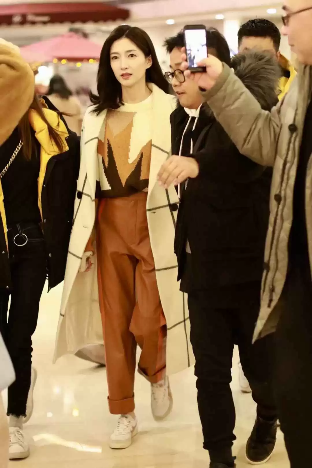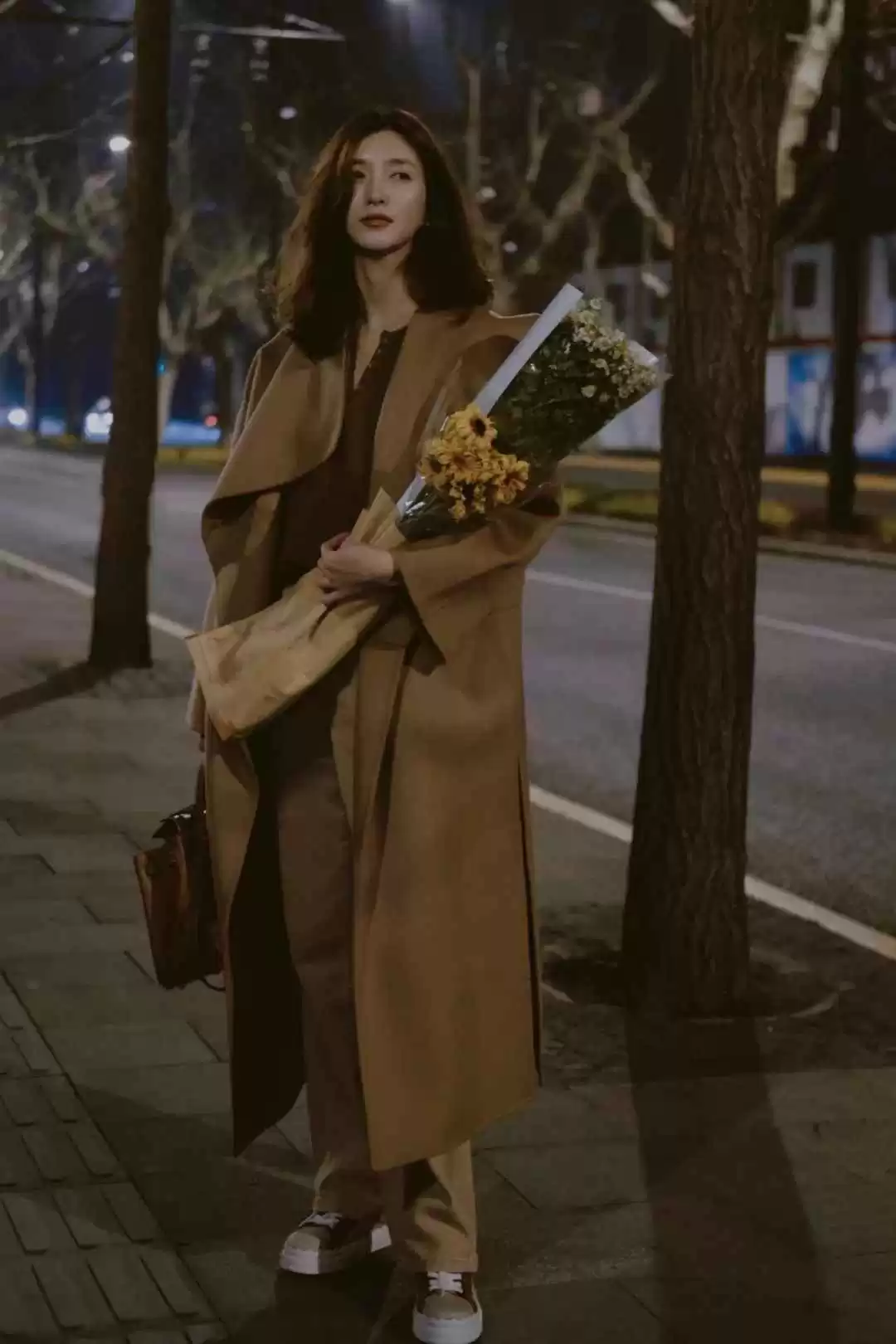 如果你觉得长风衣或大衣不好搭,学学江疏影。她不会用深色裤子配米色大衣,那样容易显老气,而是用同色系打造整体感,或者搭蓝色牛仔裤减龄。