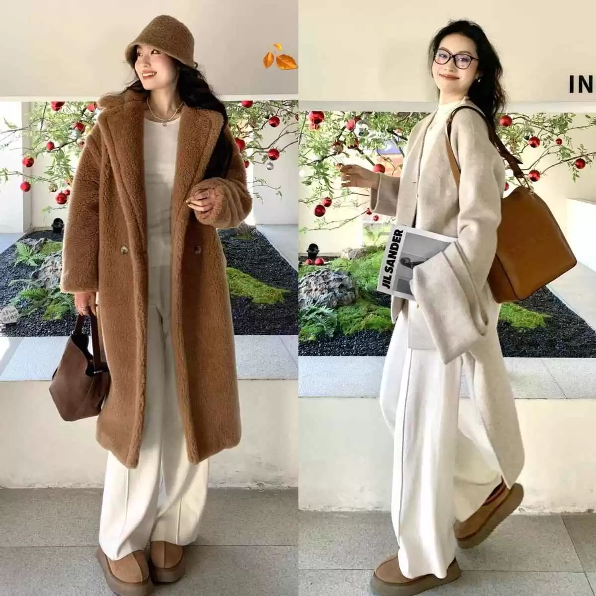 穿搭秘诀:质感与风格的双重选择:左边泰迪熊大衣走复古奢华路线,搭配同色系帽子和包包,用白色内搭和裤装平衡厚重感;右边浅米色大衣体现简约高级风,用棕色包包和鞋子呼应,手持杂志增加文艺范儿。同色系与邻近色搭配技巧:左边从大衣到配饰形成棕色系渐变,和谐统一;右边浅米色与棕色属于邻近色,搭配起来层次丰富又不失协调。 outfit 细节左边是棕色泰迪熊长款大衣,内搭白色衣物,下装白色阔腿裤,脚穿棕色厚底鞋,搭配棕色毛绒渔夫帽和棕色手提包;右边是浅米色长款大衣,内搭白色衣服,下装白色阔腿裤,脚踩棕色厚底鞋,手拿棕色手提包,手持印有 “JIL SANDER” 的杂志。热门标题:《泰迪熊大衣 VS 简约毛呢,复古奢华与高级简约,你 Pick 哪款》