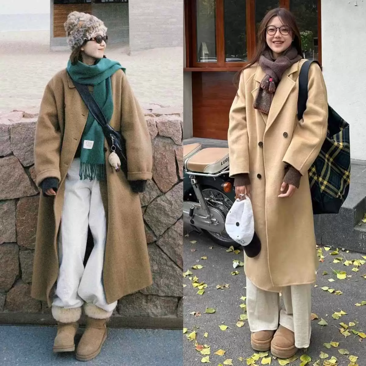 穿搭灵感:驼色系的多样风格演绎:以驼色大衣为基础,左边用绿色围巾和毛绒帽打造复古休闲风;右边用棕色围巾和格纹包呈现文艺复古感。配饰如何改变整体风格:不同颜色的围巾、帽子和包包,让同一件驼色大衣焕发全新魅力,配饰成为风格转换的关键元素。 outfit 细节左边是驼色长款大衣,内搭深色衣服,下装白色阔腿裤,脚穿棕色雪地靴,搭配绿色围巾、毛绒帽和黑色斜挎包;右边是驼色长款大衣,内搭棕色衣物,下装米色阔腿裤,脚踩棕色厚底鞋,搭配棕色围巾、格纹大包和白色帽子。流行标题:《一件驼色大衣 N 种穿法!靠配饰切换风格,秋冬穿搭不重样》