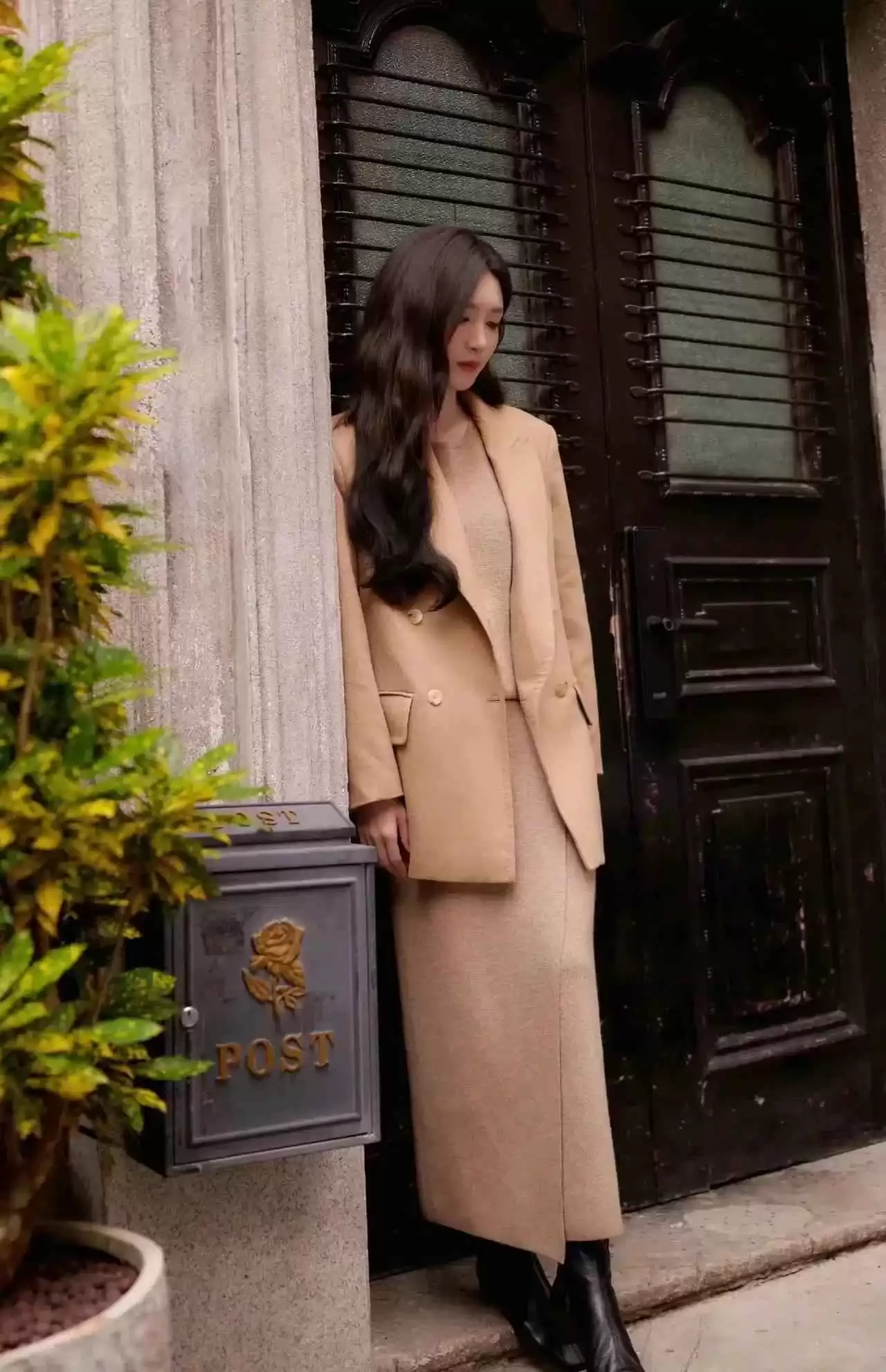 江疏影这身驼色西装配半裙和黑皮鞋,高级感瞬间拉满!