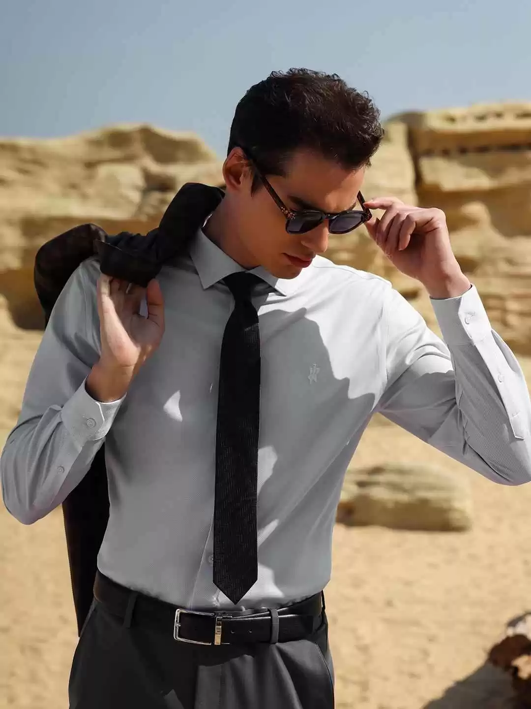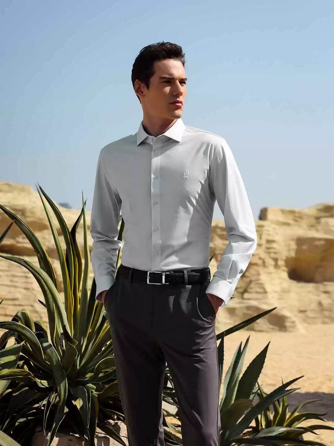 当灯光扫过衬衫表面,细密织纹和微弹质感若隐若现,既保持了商务着装的专业性,又以“头等舱”级别的体验诠释了新派商务美学——不再局限于黑白灰的保守,而是通过面料科技和细节,让严谨场合的穿着兼顾舒适和时尚。