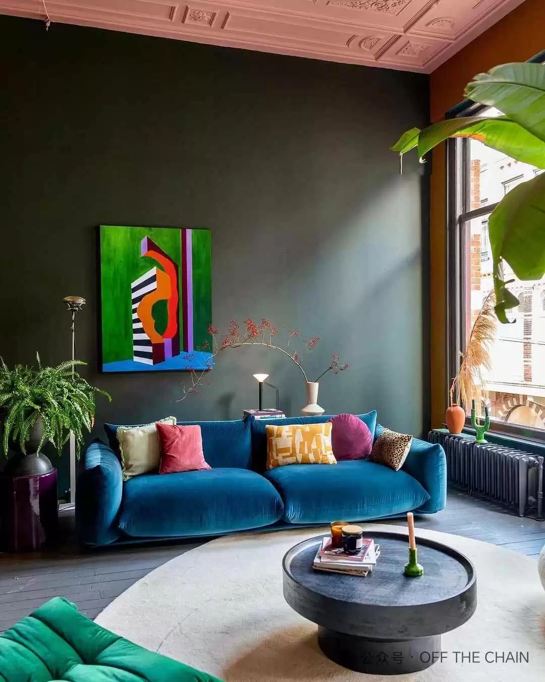 灰蓝绿沙发配白色背景墙最不会出错,尤其适合北欧风。白色墙面能让沙发成为焦点,再加点绿植点缀,客厅立马变文艺范儿。