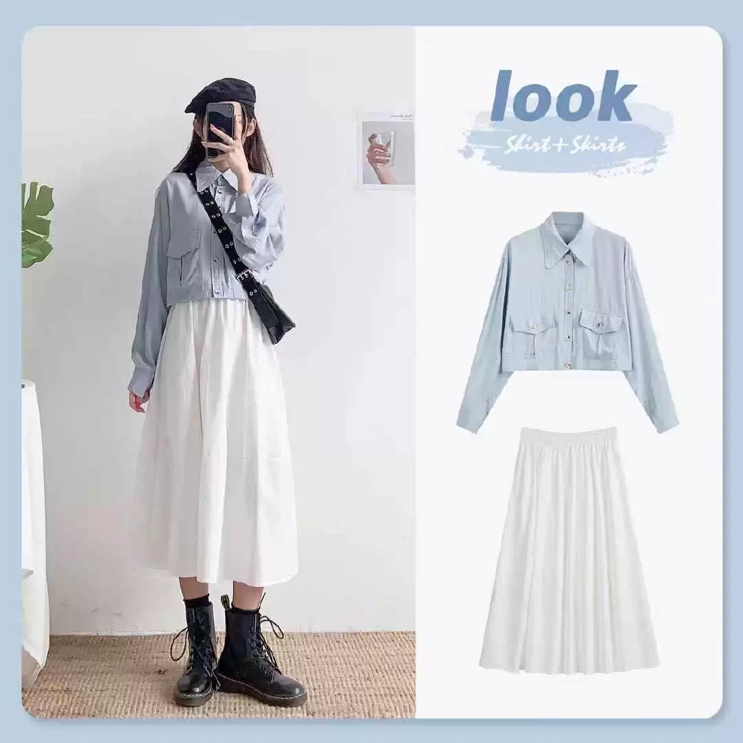 浅蓝色衬衫搭配杏色半身裙,穿出甜美女人味,超减龄。高级的蓝色加上温柔的杏色,把淑女气质完美展现,斯文又有韵味。可以试试双马尾辫造型,更显可爱,配个今年超火的腋下包,精致度up。