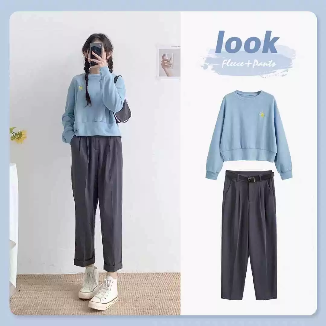 想穿得更活力点,可以选一件蓝色短款卫衣,配一条休闲宽松西装裤。短款设计能秀出腰部线条,九分裤露出脚踝,显瘦又显高。搭一双白色高帮帆布鞋,休闲运动风十足,看起来更青春。