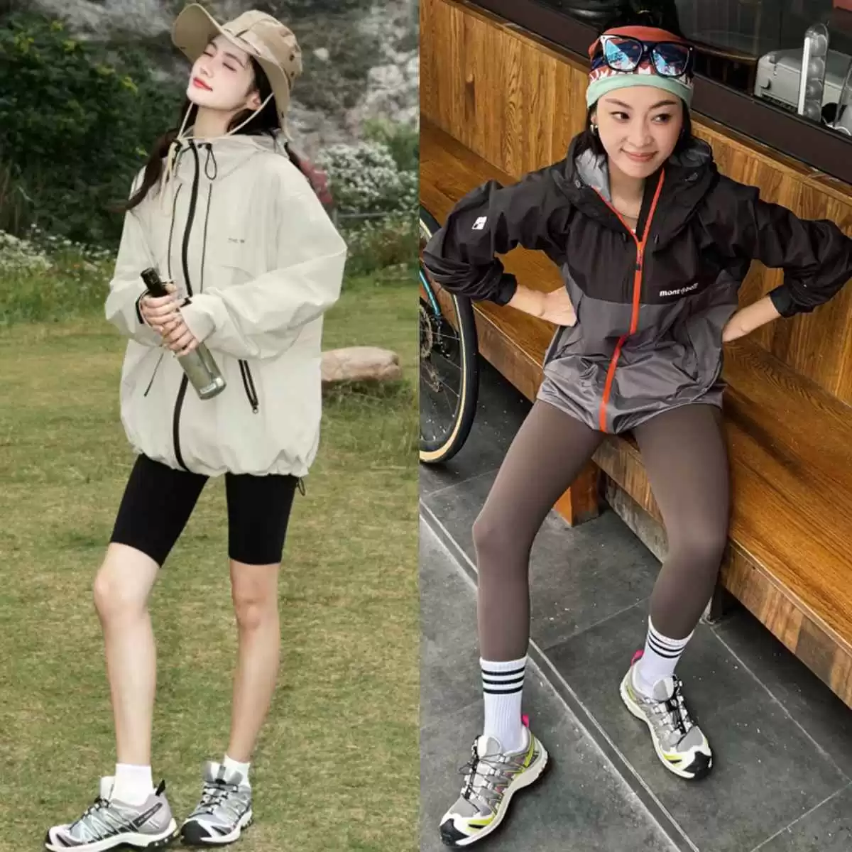 “冲锋衣+瑜伽裤+萨洛蒙”偏户外风,直接穿去上班可能有点违和。简单一招:在瑜伽裤外叠加袜套,这个小细节能中和风格,让穿搭更日常、更显瘦,瞬间提升潮流感。