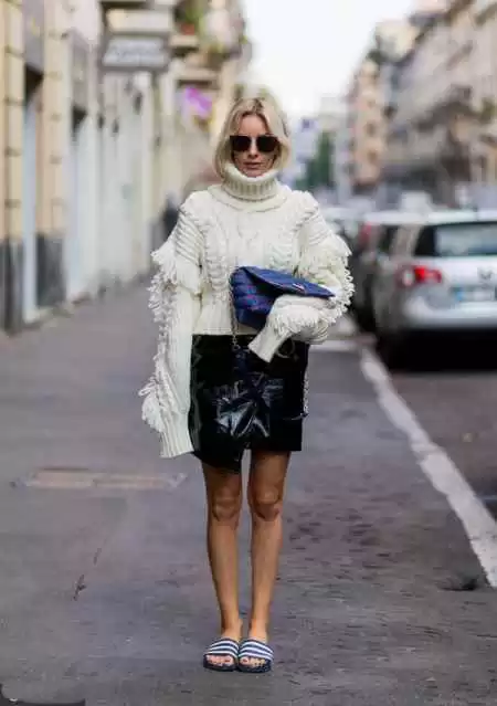鞋子往往决定了你整套LOOK的风格走向。毛衣+半裙配长靴,是帅气女人味;配乐福鞋和中筒袜,就是复古学院风-1。毛衣+裤子配老爹鞋,是休闲运动风;配尖头短靴,则是利落通勤风-8。袜子也可以玩出花样,露出一截有花纹或鲜艳颜色的袜子,是时髦精的小小叛逆。