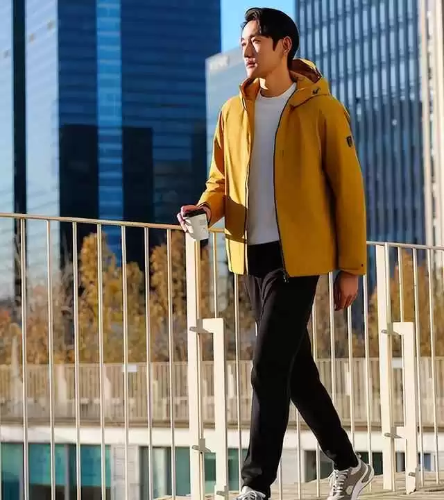 试试科技感强的商务冲锋衣,配一双环保运动鞋,既前卫又实用。