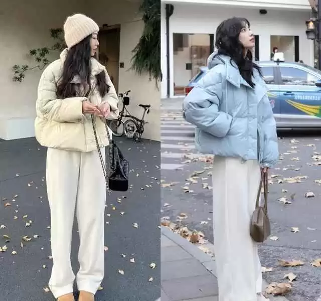 梨形身材的朋友可以选择下摆更修长的直筒白裤,搭配臀部线条简洁的羽绒服;苹果身材则适合中长款羽绒服与高腰阔腿裤叠穿,轻松隐藏不足。