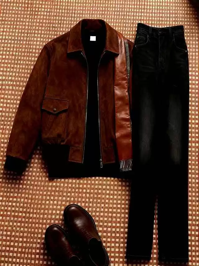 焦糖棕别配卡其裤,否则像咖啡兑豆浆。直接搭黑色直筒牛仔,裤脚微堆,鞋面选深棕麂皮,腰带和手表带同色系,全身上下只有两个颜色,复古痞帅感就出来了,拍照不用加滤镜。