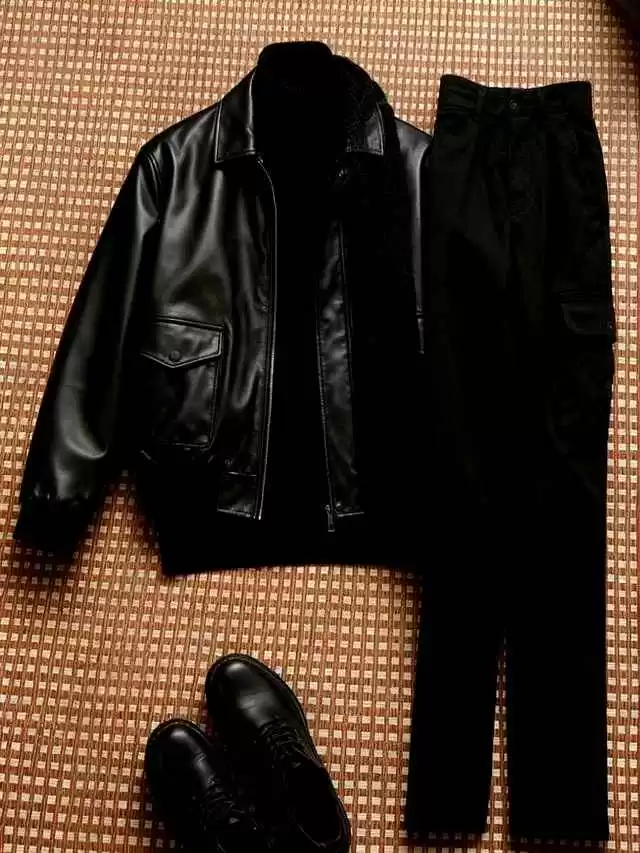 全黑不是一身黑就能高级。皮夹克选哑光羊皮,围巾换粗针织炭黑,纹理对比出来了,脸被衬得发光。裤子选微锥牛仔,黑色里带一点灰纱线,走动时隐约反光,女生才会多看一眼。