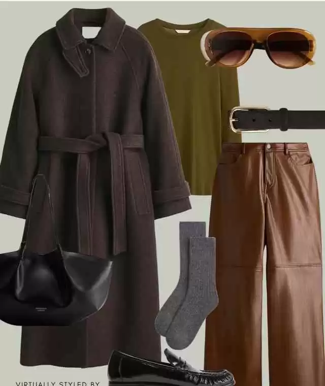 色彩搭配方面:巧克力色配咖色皮裤,再加一件深海蓝高领,复古又高级。