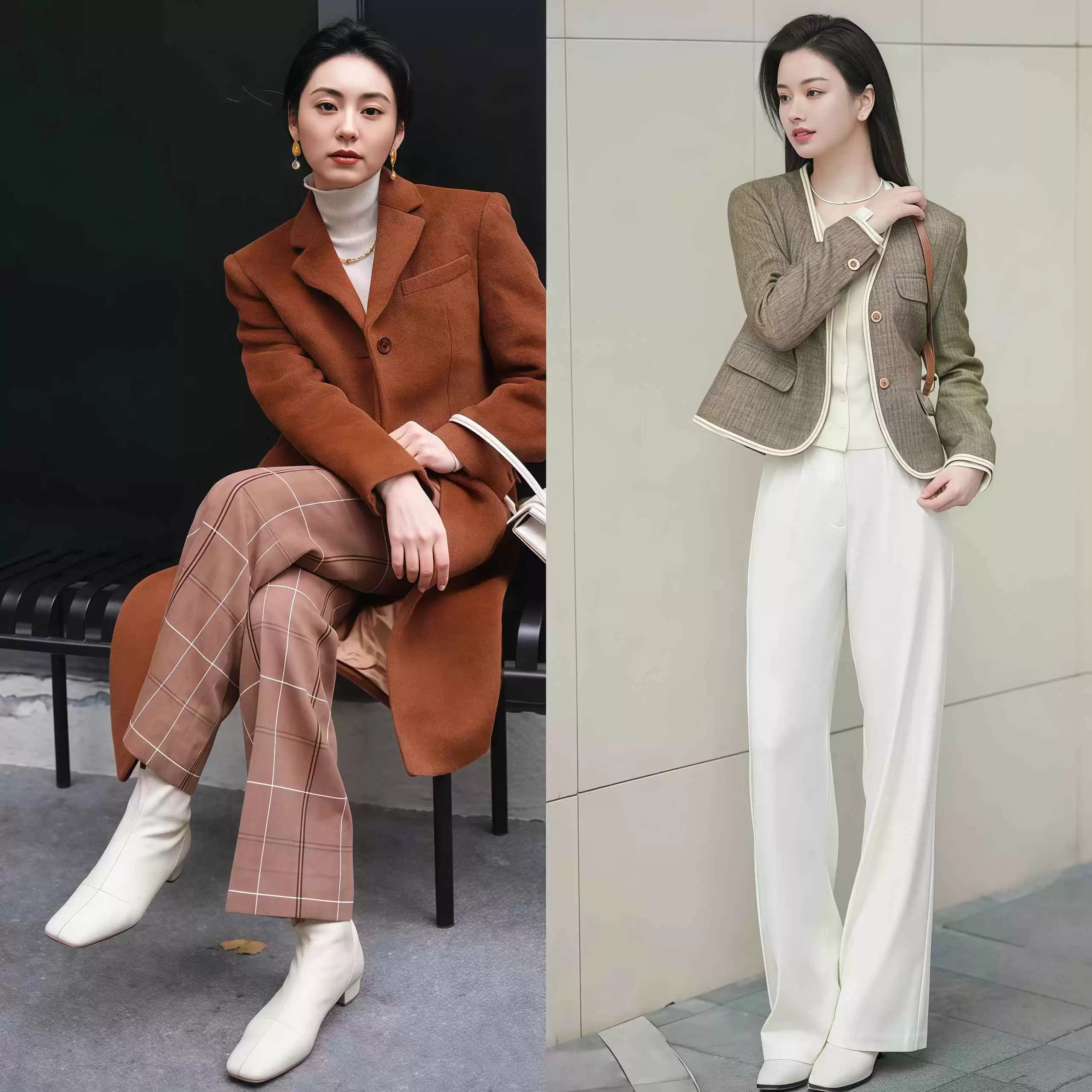 建议选九分裤,或者把长裤卷边,让裤脚和靴口刚好衔接,这样不仅干练,还能突出腿长。