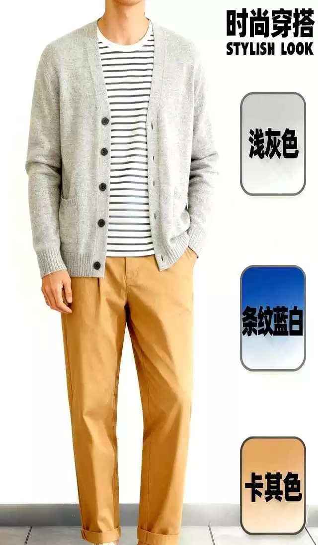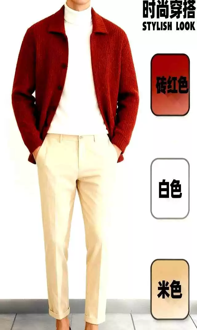 不同场合的搭配也得讲究。商务场合,驼色大衣配黑色高领和深灰西裤,简约又保暖,适合正式活动。休闲时,砖红开衫搭米色裤子,配麂皮鞋,简单有型;军绿夹克配卡其裤,内搭重磅卫衣,抗皱又暖和。潮酷风格的话,全黑风衣加银色配饰,酷感十足。日常通勤,浅灰开衫配蓝白条纹,细节处理更显精致。