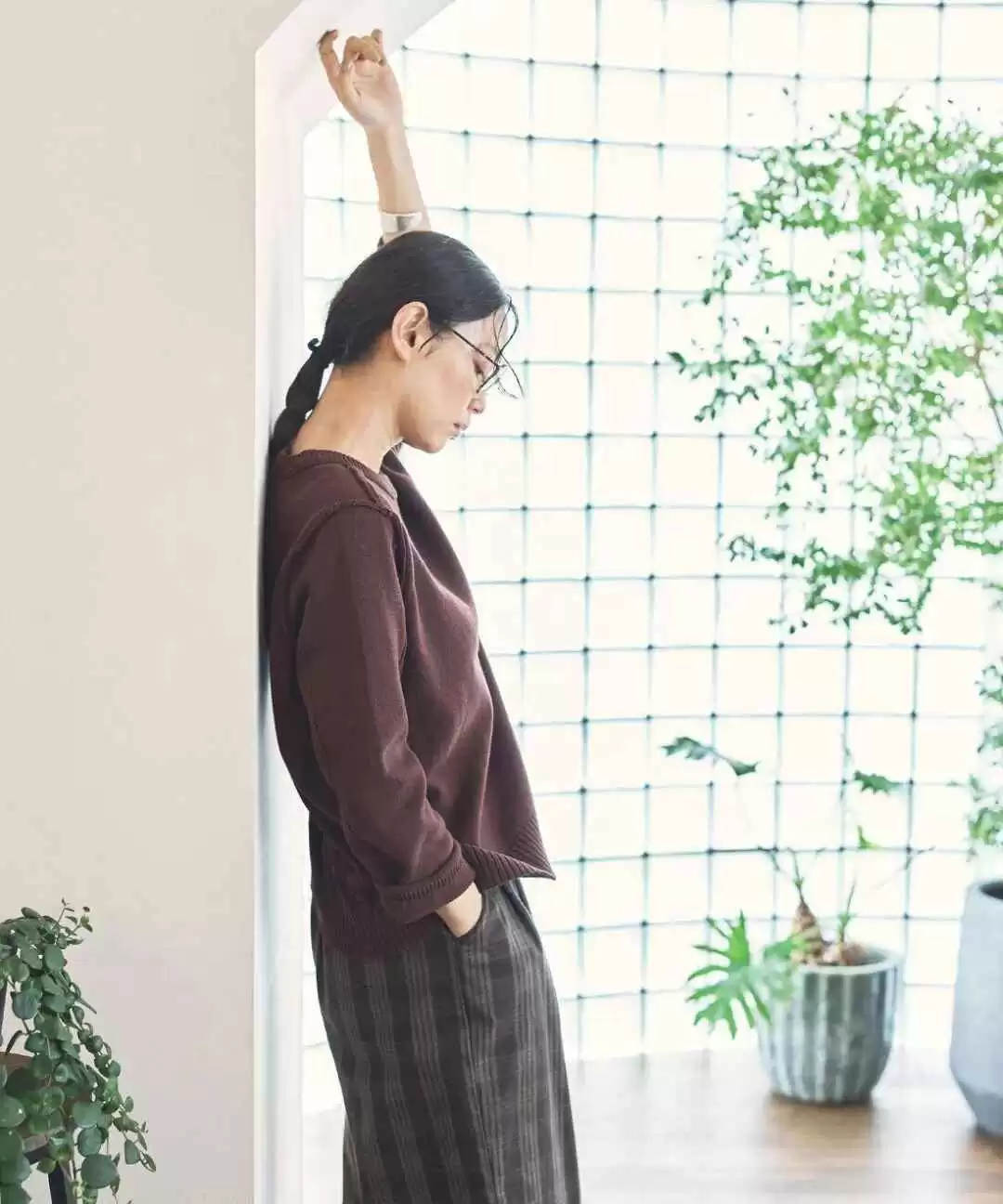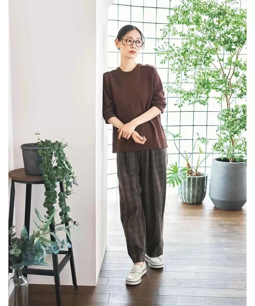 美拉德风格的棕色上衣,自带森林的木质温暖感,配上深色格纹长裤,全身都散发着质朴自然的气息。