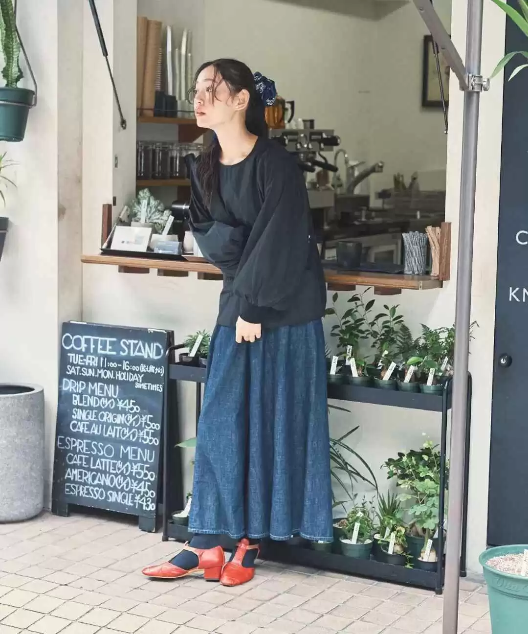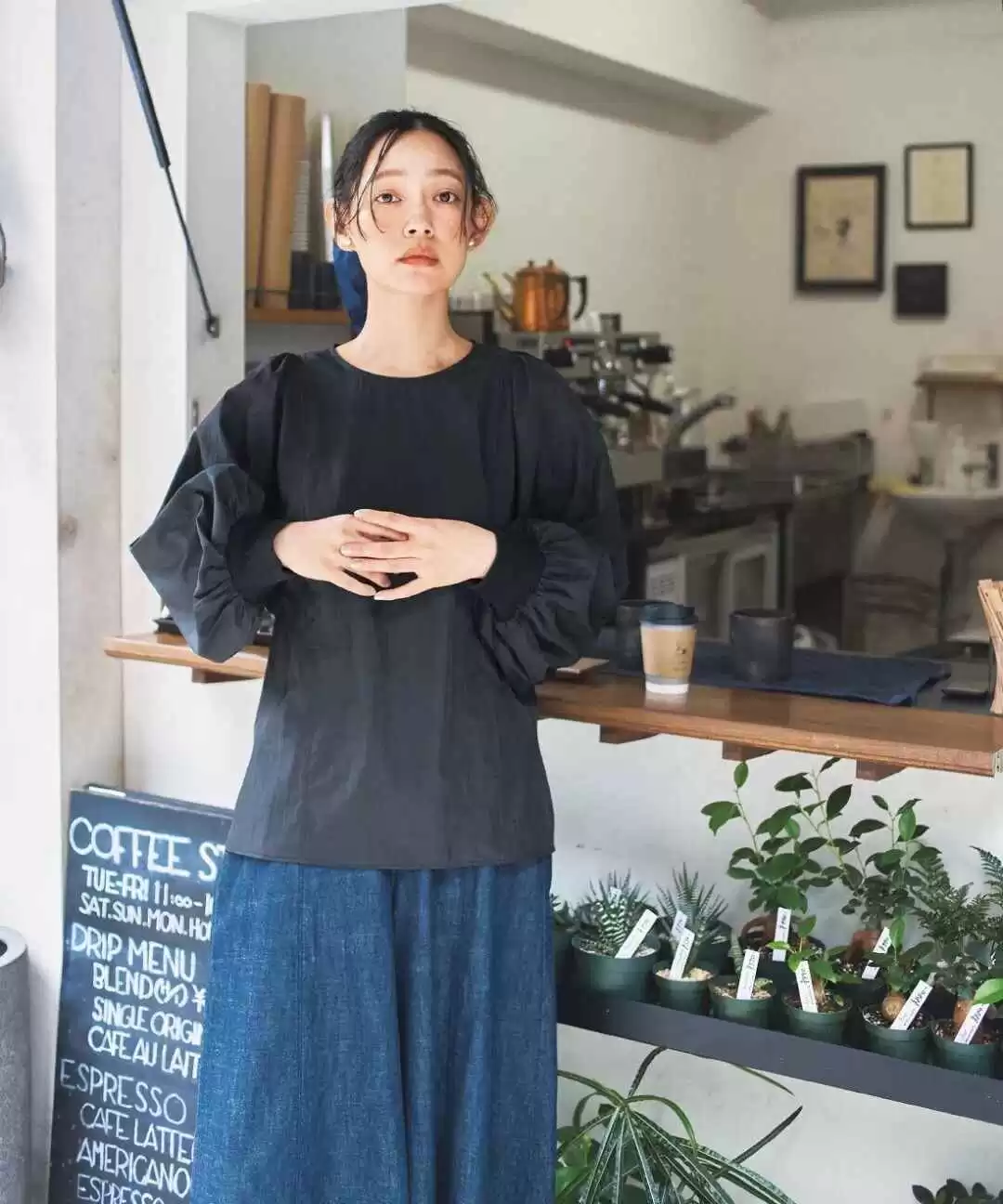 黑色上衣容易显得普通,但泡泡袖的设计注入了法式浪漫,配上牛仔半裙,仿佛把森林的宁静与生机穿在了身上。
