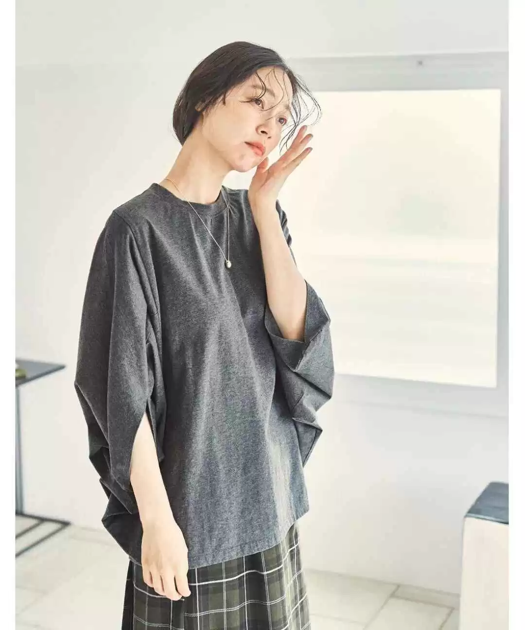 素雅的灰色上衣低调又耐看,蝙蝠袖的设计为基本款增添了新意,搭配格纹半裙,充满了大地的温暖感,秋冬氛围瞬间拉满。