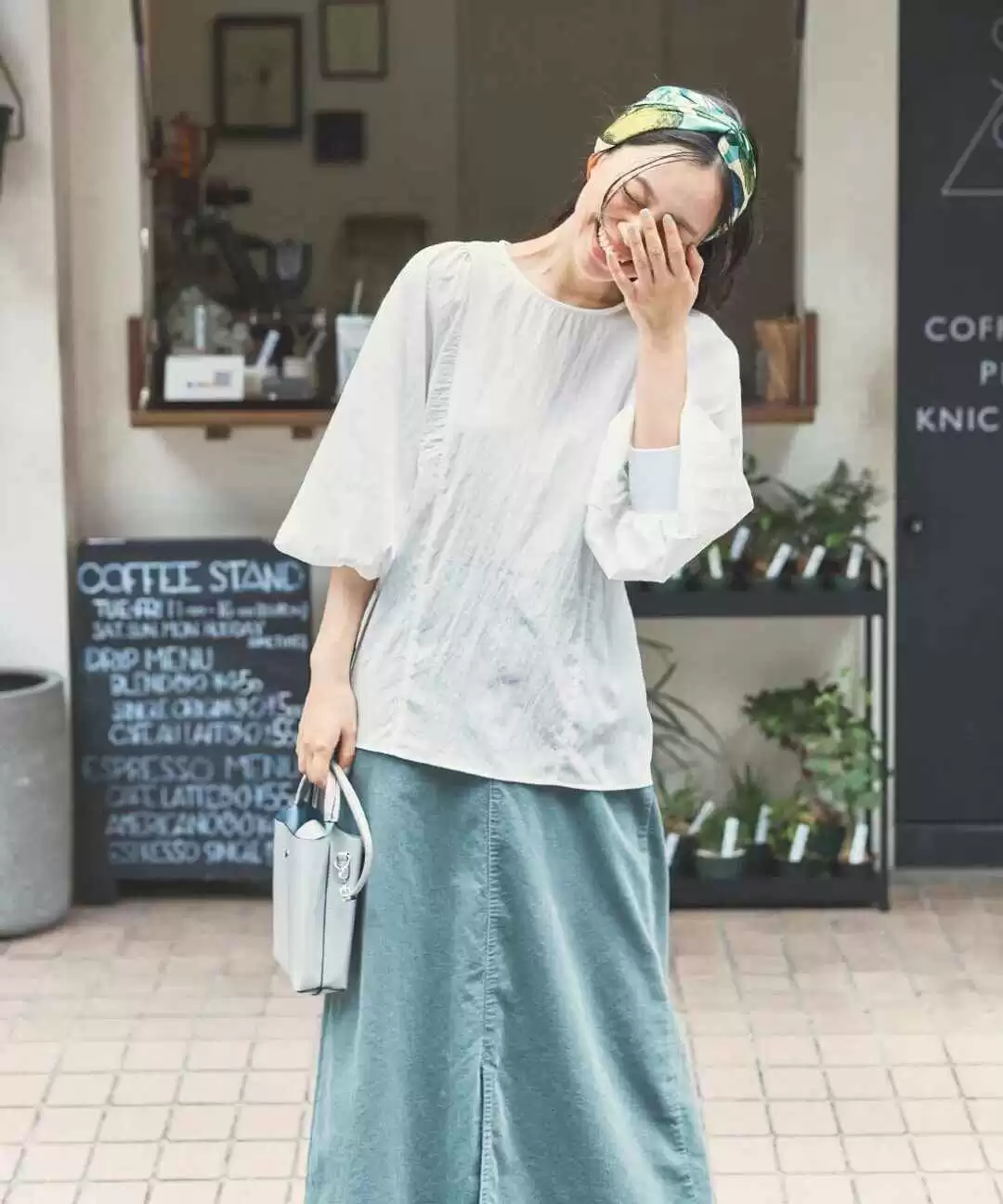 白色上衣的宽松剪裁让身体自由呼吸,拒绝束缚。花色发带增添田园风情,为整体造型带来文艺感。