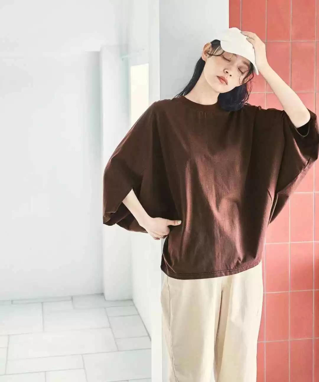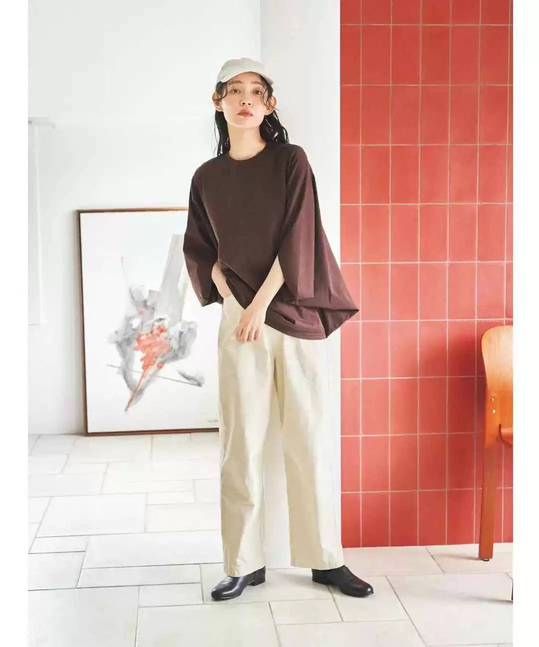 蝙蝠袖的棕色上衣营造出慵懒随性的氛围,不必追求完美,略带褶皱更显自然不做作。
