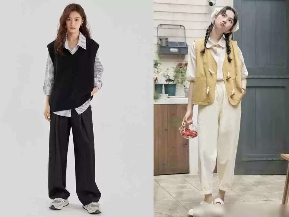 那选材质轻薄点的,比如棉麻衬衫配针织小马甲,两层加起来都比一件厚T恤轻,哪里会显壮?