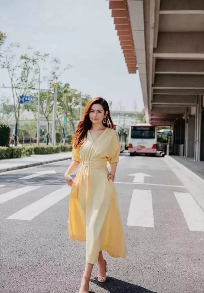 连衣裙颜色选择多,夏天常见黑白浅蓝,但亮黄色穿的人少——毕竟亚洲女生多是黄皮,穿不好容易显黑。皮肤白的妹子就能轻松hold住,像Selina这款黄裙,V领设计不挑身材,谁穿都显瘦。