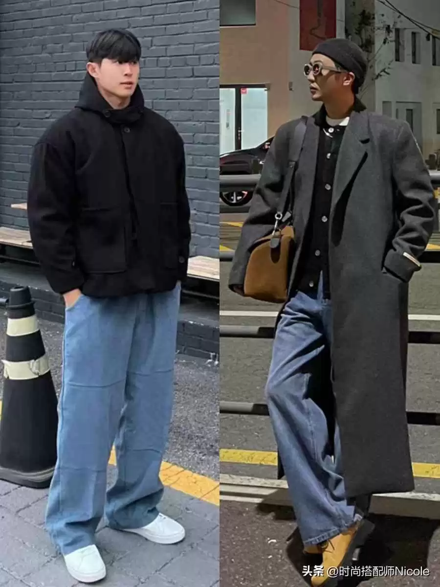 在黑白灰基础上,牛仔的加入不突兀,反而丰富了层次,让造型更饱满,配运动鞋就像校园学长,配撞色马丁靴就变街头潮人。
