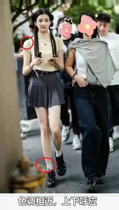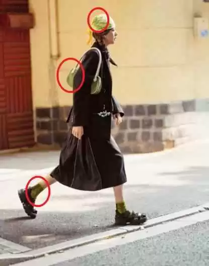但一身同色系容易显得呆板,鞋子和裤子之间最好用其他颜色隔开,突出腿部和脚部。选择和上衣相近的颜色用在脚上,比如鞋子或袜子,可以增加细节,丰富整体。