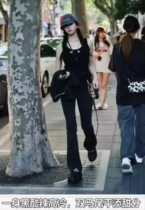 或者一身黑加金属元素和鸭舌帽,整体是酷帅风,但配上双马尾和厚底鞋,就多了点俏皮,甜酷感十足。