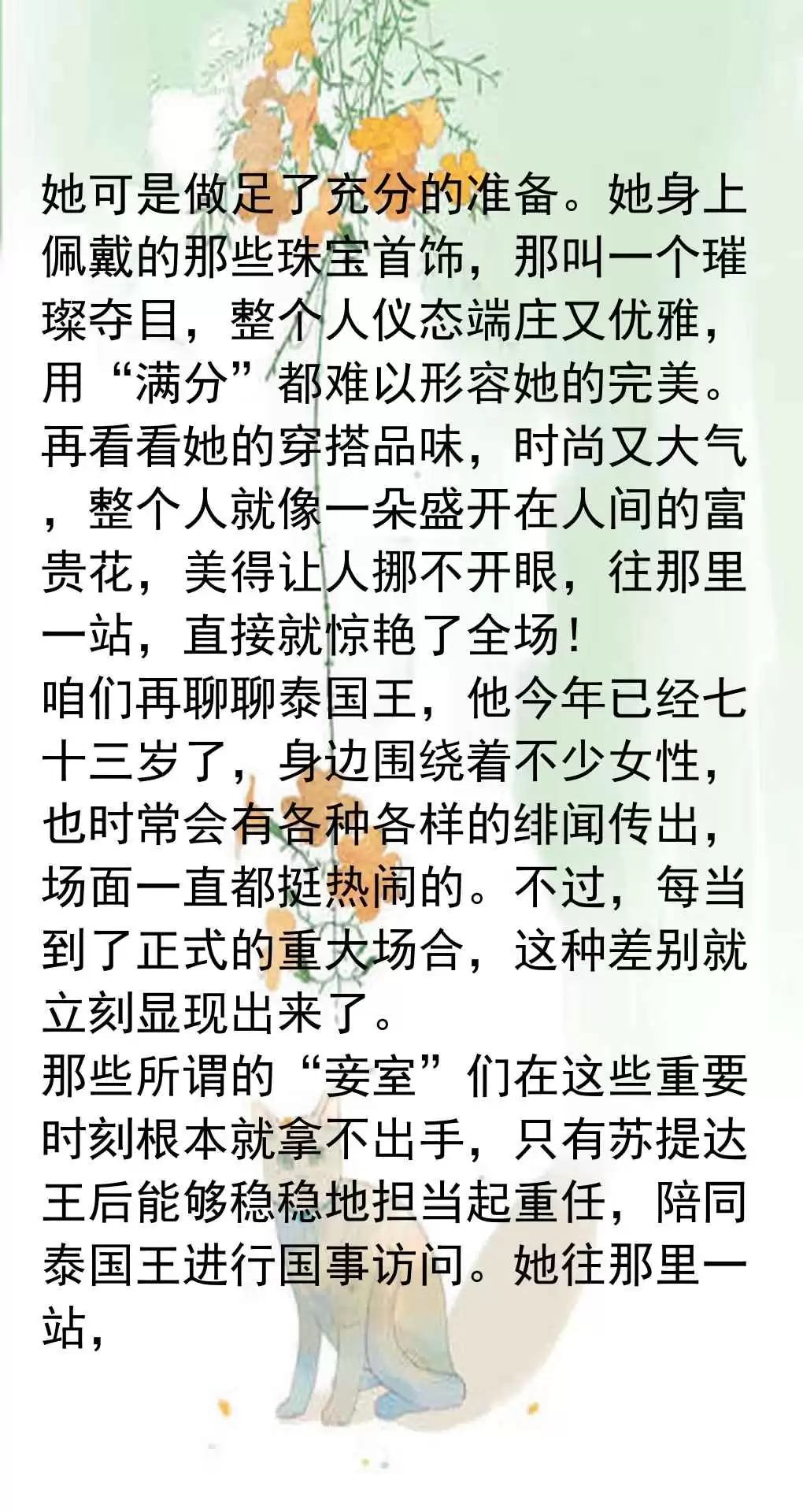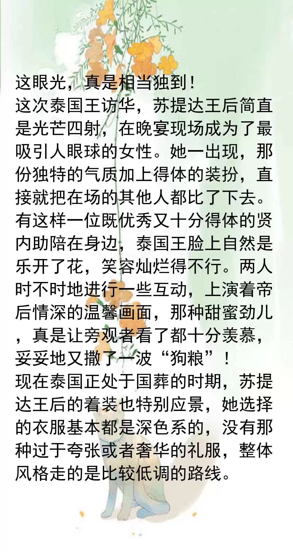 最近泰国王后苏提达跟着泰王一起来中国访问,媒体对她的报道简直太给力了,把她的形象塑造得特别正面。文章里重点夸了她的穿衣打扮,说她穿的那件蓝色丝绸礼服既大气又端庄,活脱脱像一朵“人间富贵花”,一亮相就惊艳了全场,给泰国王室挣足了面子。泰王看起来也特别满意,脸上都笑开了花,这效果没得说。另外,文章还强调了苏提达的个人能力,说她拿了五十多个博士学位,是个实打实的全能型人才,妥妥的得力助手。这跟那些光有漂亮脸蛋却没真本事的女性一比,更显得苏提达能当上王后不是偶然,而是泰王眼光独到。从成长历程看,苏提达刚进宫时还有点青涩拘谨,穿衣也不出彩,但现在完全变了样,端庄典雅,美得清新脱俗,连脸部都显得自然抗老,这说明她对王后工作已经熟门熟路了。泰国王室内部关系复杂,女眷多绯闻也多,但一到重要场合,只有苏提达能稳稳撑场,其他妾室根本比不了,在她雍容华贵的气质面前瞬间黯然失色。这次中国之行,苏提达成了晚宴上最耀眼的女眷,她的气质和装扮直接把别人都比下去了,和泰王互动时更是上演帝后情深,让人羡慕。目前泰国处于国葬期,苏提达的着装大多走深色低调路线,但依然盖不住她的盛世美颜。预计她在中国会吸粉无数,后续造型肯定还会惊艳大家。总的来说,这篇文章通过对比和强调,把苏提达塑造成了一个优秀、端庄、无可替代的王后形象。