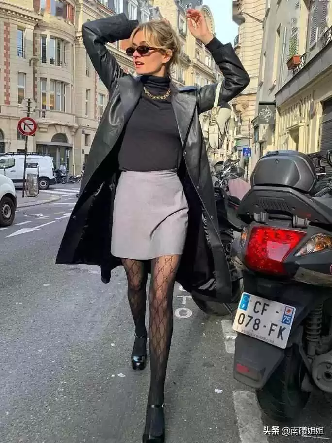 皮衣可以选基础黑或亮色如绛紫、橘红,丝袜坚持用黑色,保持质感。中长款皮衣遮臀又飒,单穿或当外套都好看。