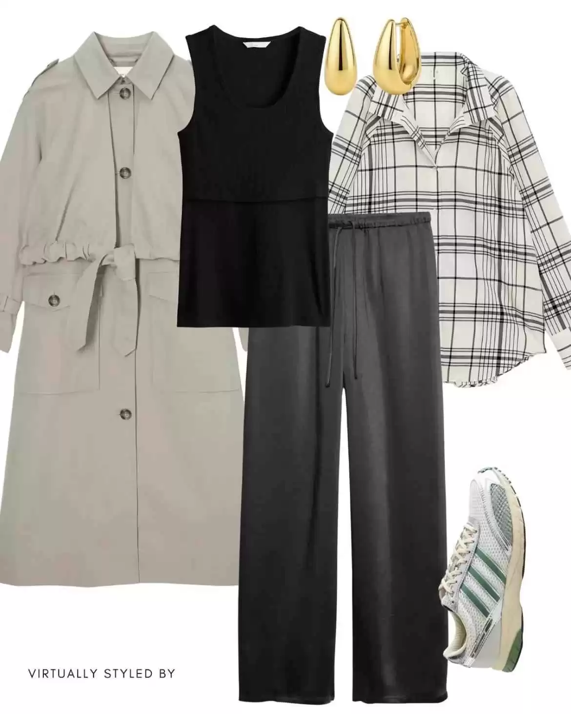米灰色风衣配皮裤,把秋天的帅气值拉满!内搭 oversized 格纹衬衫,既保暖又有型,兼顾风度与舒适度。