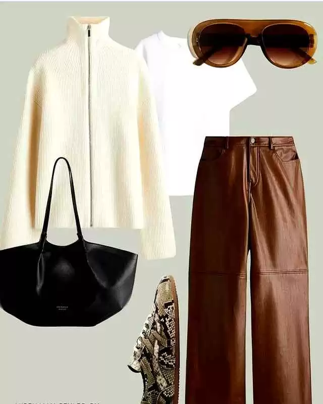 谁说皮裤不好驾驭?选对版型就没错!今年流行的直筒或微喇皮裤,藏肉效果一流,还能增添一点酷感。材质选哑光或柔光的,比亮面更容易搭配。