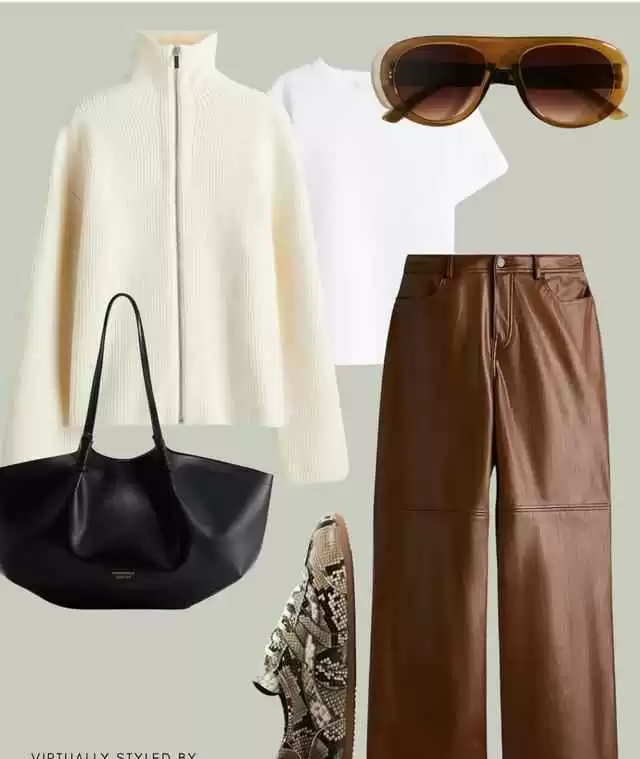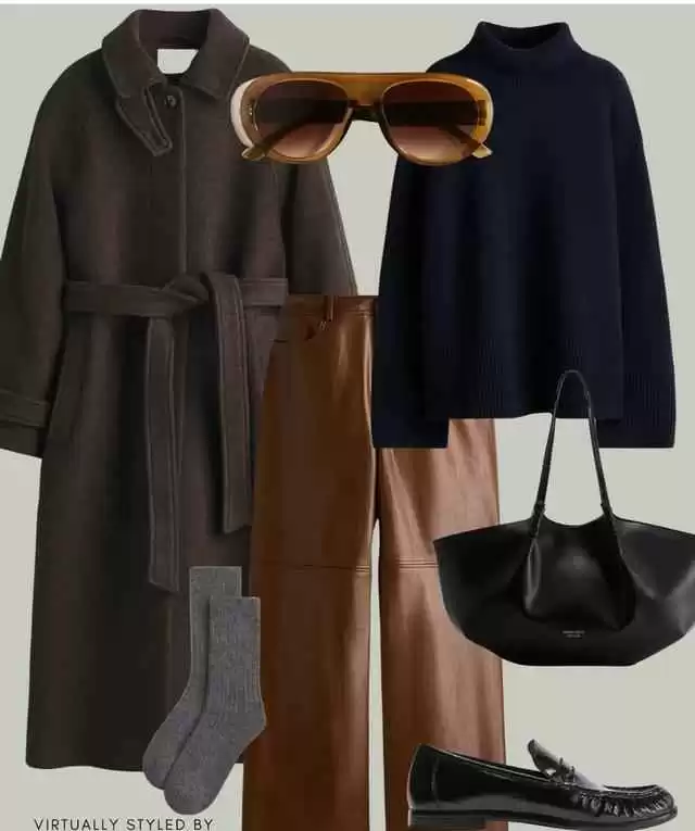 想要高级感?羊毛混纺大衣配环保素皮皮裤,焦糖咖皮质和黄铜纽扣点缀,细节满分,秋冬温暖色系穿出质感。