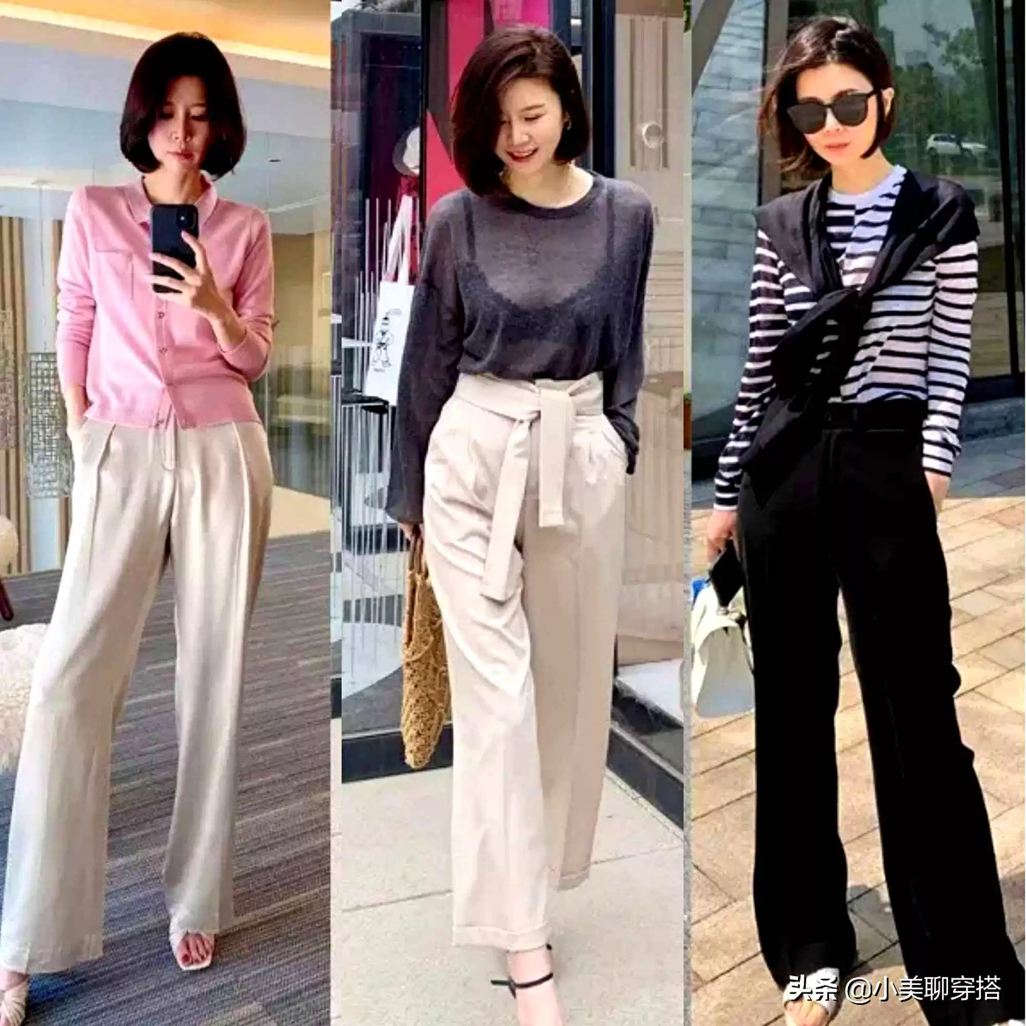 配色用“浅色+中性色”更减龄,比如淡粉针织配卡其阔腿裤,提亮肤色;冷风格就黑白条纹配黑阔腿裤,利落不刻意。