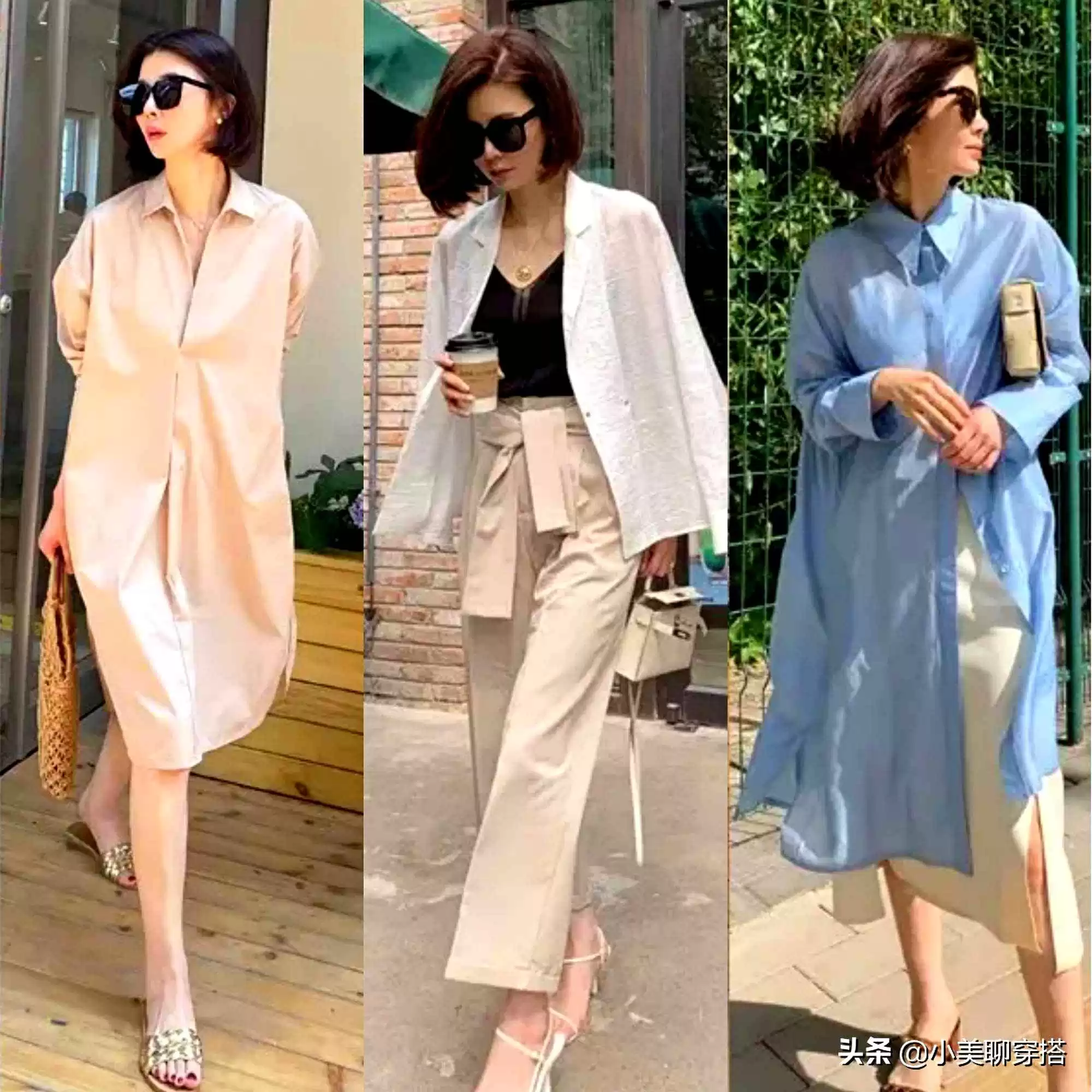 不想费心搭配?一件浅蓝或灰蓝长衬衫叠穿米白连衣裙就行。